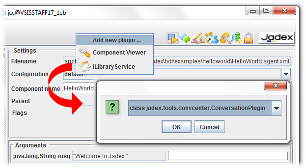 The Jadex Control Center (JCC) is the heart of most Swing based runtime tools. The JCC itself uses an extensible plugin-based mechanism to offer differnt functionalties to the user. As can be seen in the screenshot above it consists of different areas that are explained in the following: