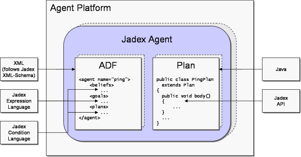 To develop applications with Jadex, the programmer has to create two types of files: XML agent definition files (ADF) and Java classes for the plan implementations. The ADF can be seen as a type specification for a class of instantiated agents. For example Buyer agents (from the booktrading example) are defined by the Buyer.agent.xml file, and use plans implemented, e.g. in the file PurchaseBookPlan.java. The user guide describes both aspects of agent programming, the XML based ADF declaration and the plan programming Java API, and highlights the interrelations between them. Detailed reference documentation for the XML definition as well as the plan programming API is also separately available in form of the generated XML schema documentation and the generated Javadocs. Figure 1 depicts how XML and Java files together define the functionality of an agent. To start an agent, first the ADF is loaded, and the agent is initialized with beliefs, goals, and plans as specified.