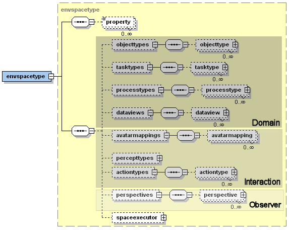 It can be seen that a space type is generally specified by declating \~objecttypes\~, \~avatarmappings\~, \~actiontypes\~, \~tasktypes\~, \~processtypes\~, \~percepttypes\~, \~views\~, \~perspectives\~ and a \~spaceexecutor\~. For the domain model we will first cover the details of \~objecttypes\~, \~actiontypes\~, \~tasktypes\~, \~processtypes\~ and the \~spaceexecutor\~. Before explaing these elements a we will have a short look on the envspacetype element itself.