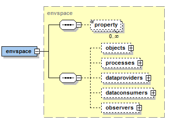An environment space has two mandatory attributes. The \~name\~ is used for identifying the space instance and the \~type\~ relates the environment space type that is the basis for the space instance. Additionally, the original \~width\~, \~height\~ and \~depth\~ attributes of the space type can be overridden at the instance level via attributes. Furthermore, space \~property\~ elements can be defined for storing arbitrary user data. The additional elements - objects, processes, data providers, data comsumers and observers - are described in the following sections.