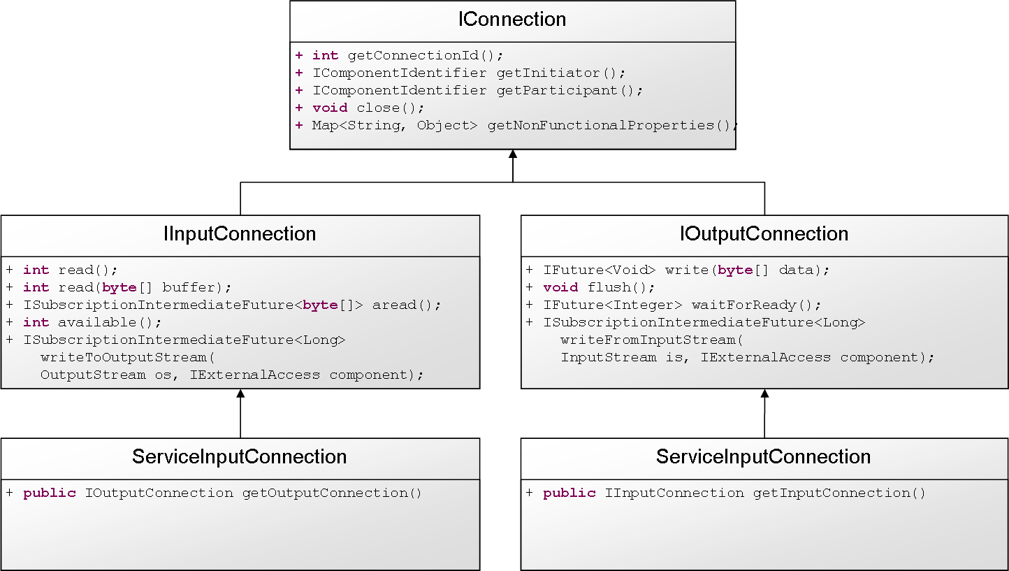 The base interface for all types of Jadex streams is IConnection, which mainly provides methods to get general information about the stream (such as the connection id, the initiator and participant component ids). From this interface IInputConnection and IOutputConnection are derived. These coarsely correspond to the Java InputStream and OutputStream and offer functionalities to read and write data. Finally, the concrete classes ServiceInputConnection and ServiceOutputConnection implement those interfaces and additionally add one important method to get a corresponding output for input connection and vice versa. The idea is that a service connection can be created within a service implementation of a component. The original service connection can then be used to e.g. write or read data and the derived opposite connection can be passed as parameter value in a method call or can be passed back as return value. In this way two services can communicate via streams. In Jadex streaming support is based on two different APIs, a low and a high level one as described next.