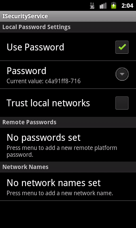 - Security Service is active by default. The generated Plattform Password will be written to LogCat and saved in /data/data/<packagename>/files/<platformname>.settings.xml. To disable the Security Service, just uncomment the Service in your platform.component.xml